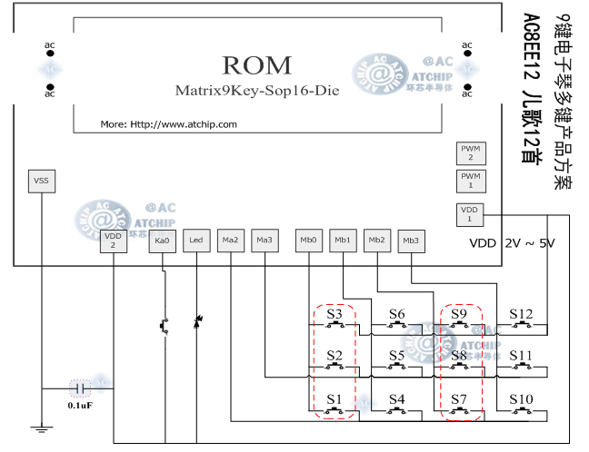 3)AC8EE12兒歌音樂電子音樂琴多鍵方案共有8個(gè)I/O口,其中1個(gè)普通按鍵選曲播放鍵,1個(gè)3HZ閃燈,其余6個(gè)IO與正極VDD矩陣組成12個(gè)功能鍵,獨(dú)立播放12首音樂,與選曲播放鍵順序相對(duì)應(yīng),標(biāo)準(zhǔn)COB封裝為AC90A十腳線路板COB,滿足12個(gè)矩陣功能鍵IO需求。
