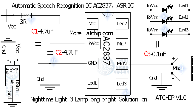 離線語(yǔ)音識(shí)別芯片-小夜燈AC2837中文版方案原理圖: