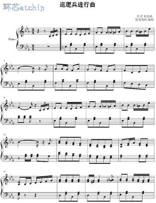 《巡邏兵進(jìn)行曲》(管弦樂曲)——米查姆曲。一譯《巡邏兵》,管樂曲,后被改編為管弦樂曲、口琴曲、木琴曲等。樂曲根據(jù)美國聞名歌曲的旋律譜成,采用二部曲式(AB),F(xiàn)大調(diào),中速,2/4拍。音樂首先奏出模擬小軍鼓聲響的引子,緊接著呈現(xiàn)的主題A,節(jié)奏明快,布AC80F滿輕松活潑的氣氛,表現(xiàn)了巡邏兵隊(duì)列輕捷的步伐。隨后呈示的主題B堅(jiān)定有力,如同一首眾人齊唱的青年歌曲,與主題A形成對(duì)比。接著旋律又轉(zhuǎn)為輕快,最后用與主題A相似的樂句結(jié)束。為了表現(xiàn)巡邏兵隊(duì)伍由近而遠(yuǎn)的動(dòng)態(tài),演奏最后一段時(shí)通常逐漸減弱音量,用隱約可聞的鼓聲和樂聲,來表現(xiàn)巡邏兵隊(duì)伍越走越遠(yuǎn)。