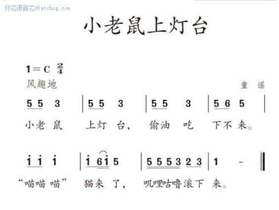 小老鼠上燈臺 是一首非常流行的兒童歌曲,歌詞簡單,曲調(diào)活潑生動,妙趣橫生,唱起來朗朗上口,富有教育意義,適合于環(huán)芯剛開始學(xué)唱歌的小寶寶們,源于東北地區(qū)的老人哄孩子用的民謠。它是幼兒園的孩子最熟悉的一首童謠,深受兒童的喜愛。